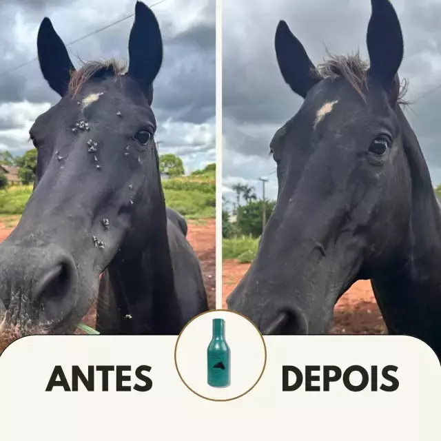 Modo de usar: Aplique de forma uniforme sobre a pelagem do cavalo utilizando, focando nas áreas mais expostas. Para aplicação na face e orelhas, utilize as mãos, uma esponja ou um pano, com cuidado para evitar inserir nos olhos e mucosas. Lave as mãos após o uso. Reaplique conforme necessário, especialmente após suor intenso ou banho.
